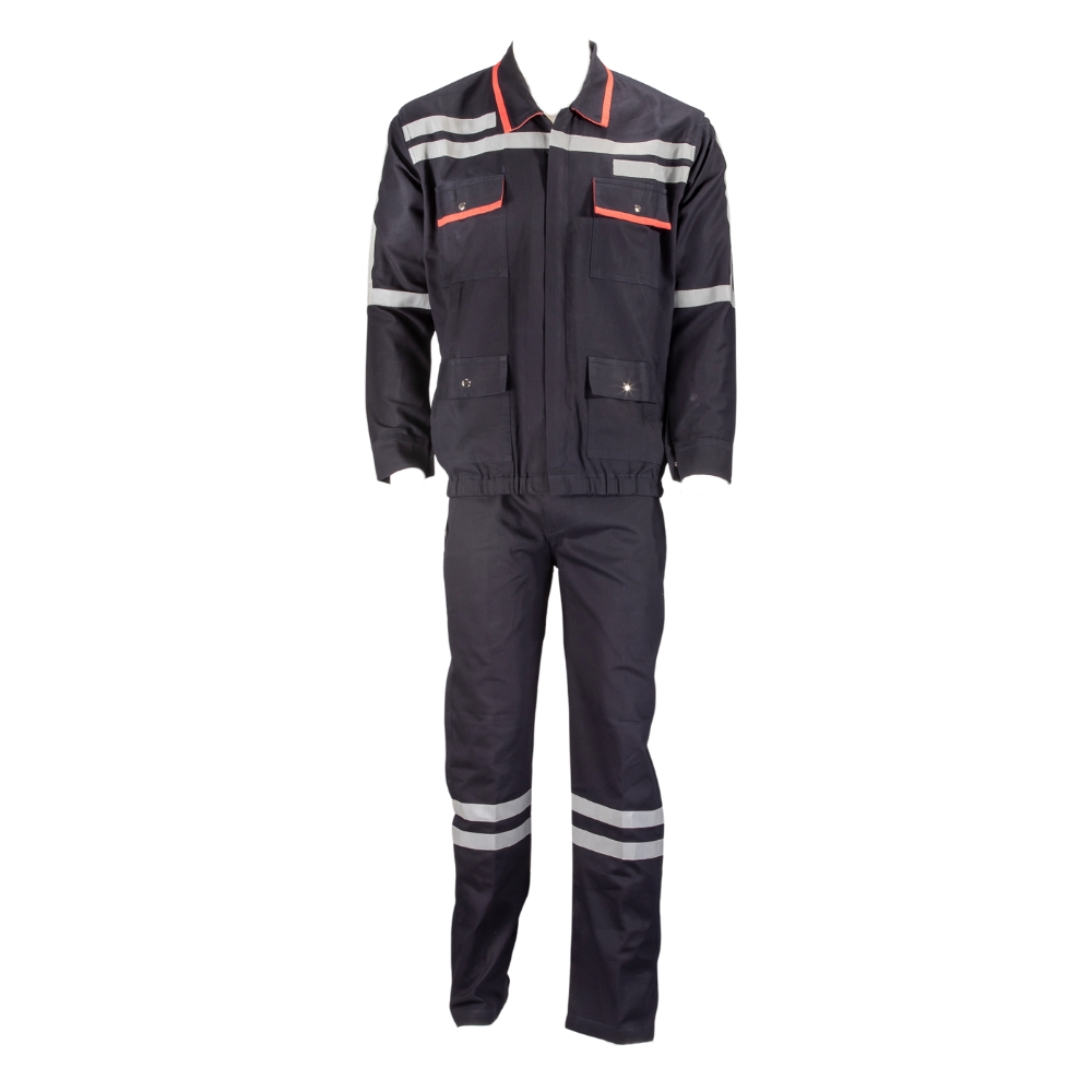 Full-sleeve shirt and pant set combining durability, safety, and style, featuring red piping for a professional look, heavy-duty brass zipper, multiple pockets, and high-visibility reflective strips for enhanced safety.